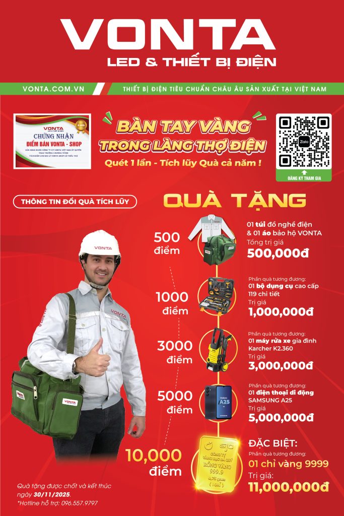 Từ ngày 15/5/2025, khi mua các sản phẩm của Vonta có mã QR tích điểm tại các đại lý Vonta-Shop ủy quyền, thầu thợ chỉ cần thực hiện thao tác đơn giản: quét mã QR có sẵn trên hộp sản phẩm thông qua ứng dụng Zalo để tích điểm đổi thưởng với giá trị vô cùng hấp dẫn với các mốc đổi thưởng: