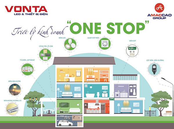 Hiểu rằng chỉ khi sản phẩm ở mức đồng bộ cao mới có thể chinh phục được khách hàng khó tính nhất, VONTA đưa ra triết lý kinh doanh là “One Stop” – nghĩa là khách hàng chỉ cần đến “một điểm dừng” là VONTA sẽ có đầy đủ các sản phẩm về thiết bị điện và chiếu sáng từ sản phẩm cơ bản đến đặc thù dành cho mọi dự án (từ toà nhà hành chính văn phòng, trường học, bệnh viện, chung cư, căn hộ đến đường giao thông …) hay mọi phong cách từ truyền thống đến hiện đại.