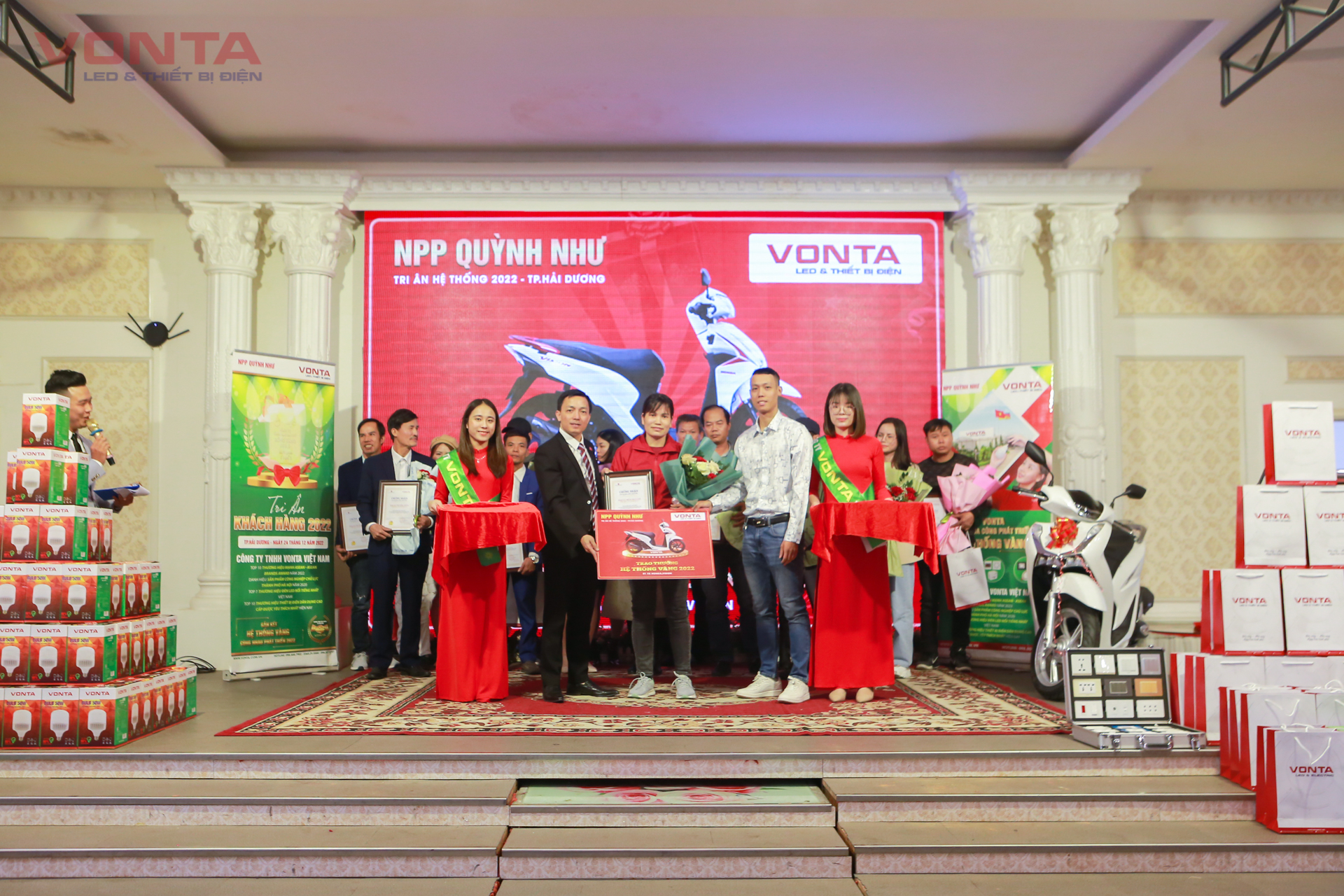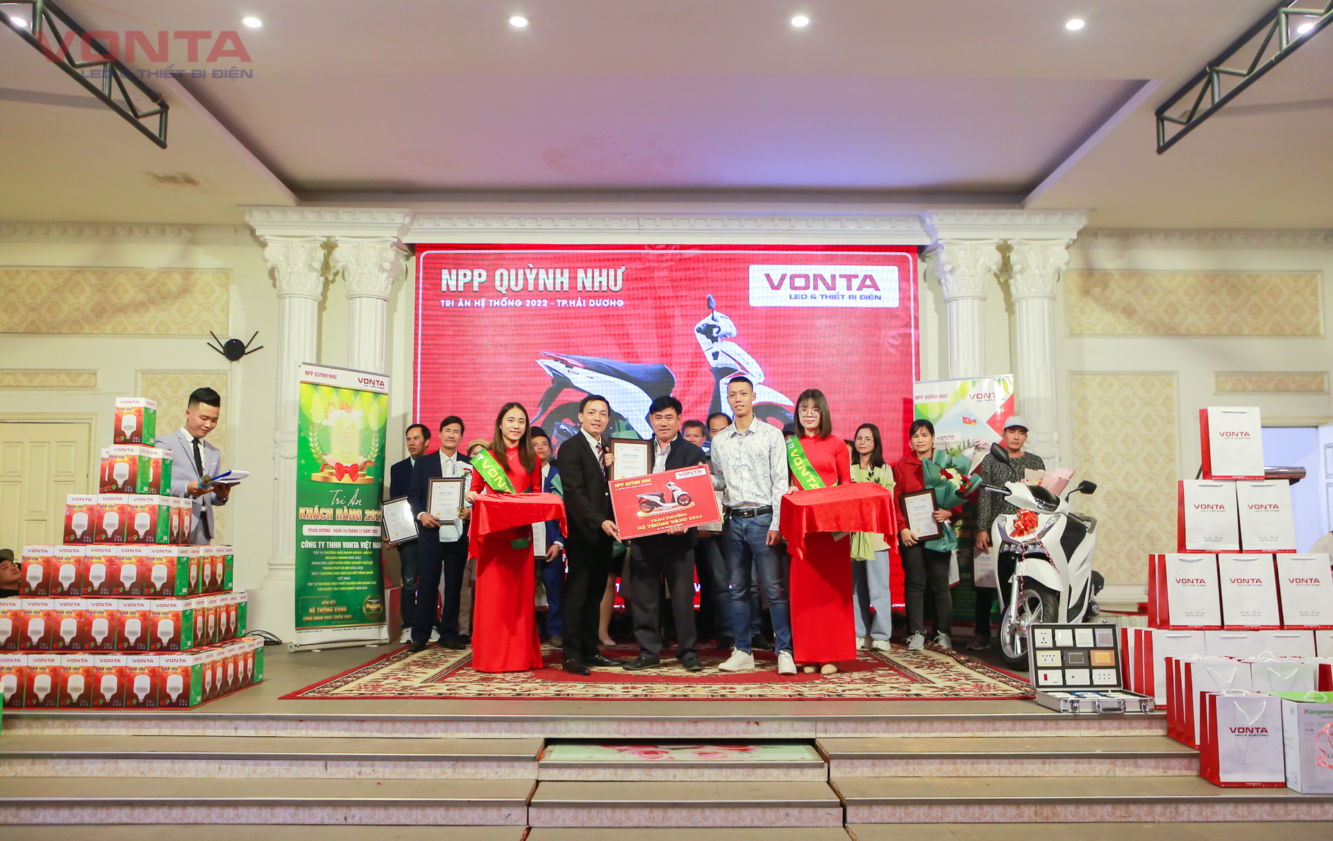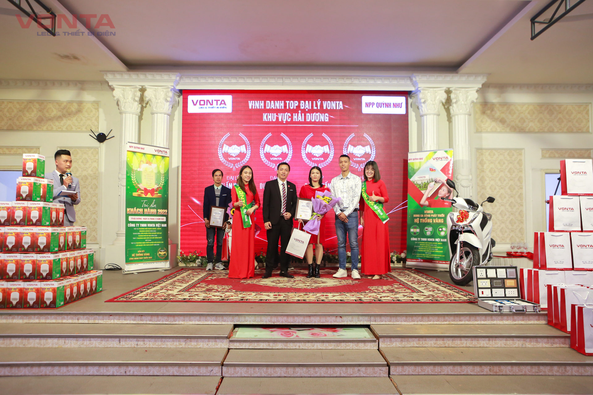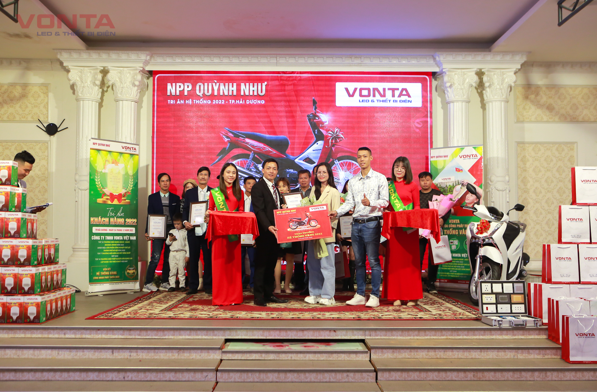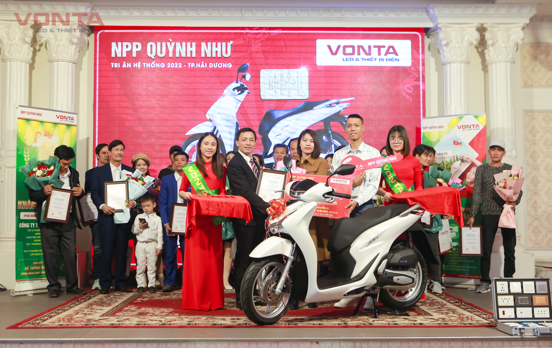 Tại buổi lễ, Công ty TNHH VONTA Việt Nam và NPP Quỳnh Như đã vinh danh trao – chứng nhận cũng như quà tặng Vàng cho các đại diện Top Hệ Thống Vàng, Đại Lý Vonta tại Hải Dương trong năm 2022. Trong đó đặc biệt đã có đại lý xuất sắc được vinh danh Top Hệ thống vàng 6 Sao và đón nhận giải thưởng cực lớn: 01 xe Honda SH & 1 cây vàng.