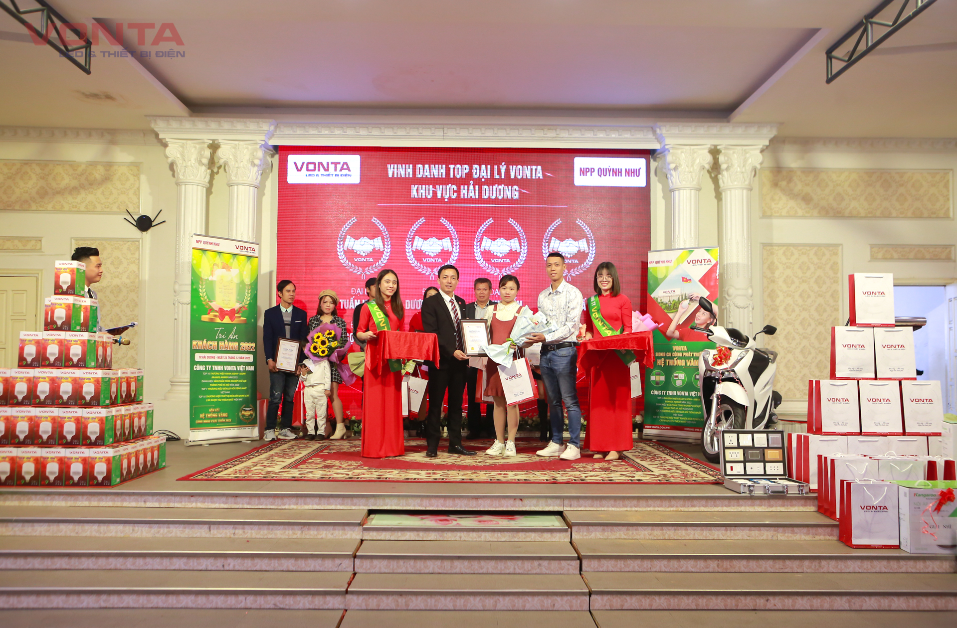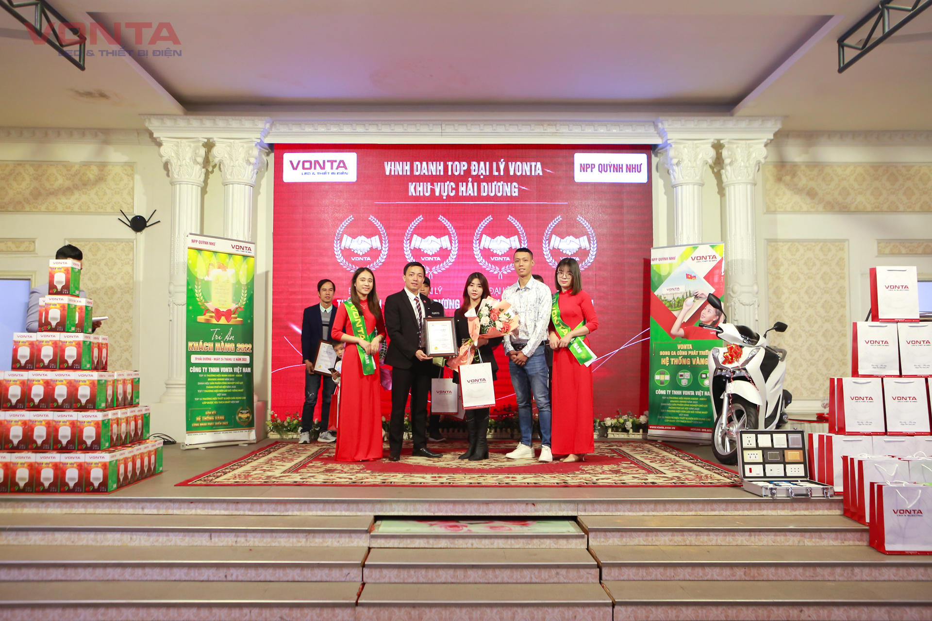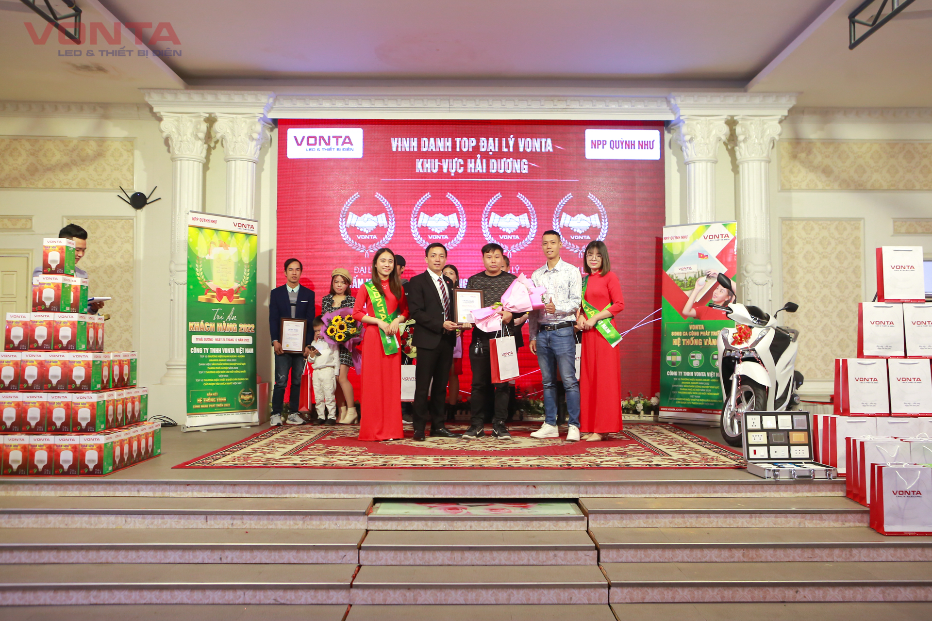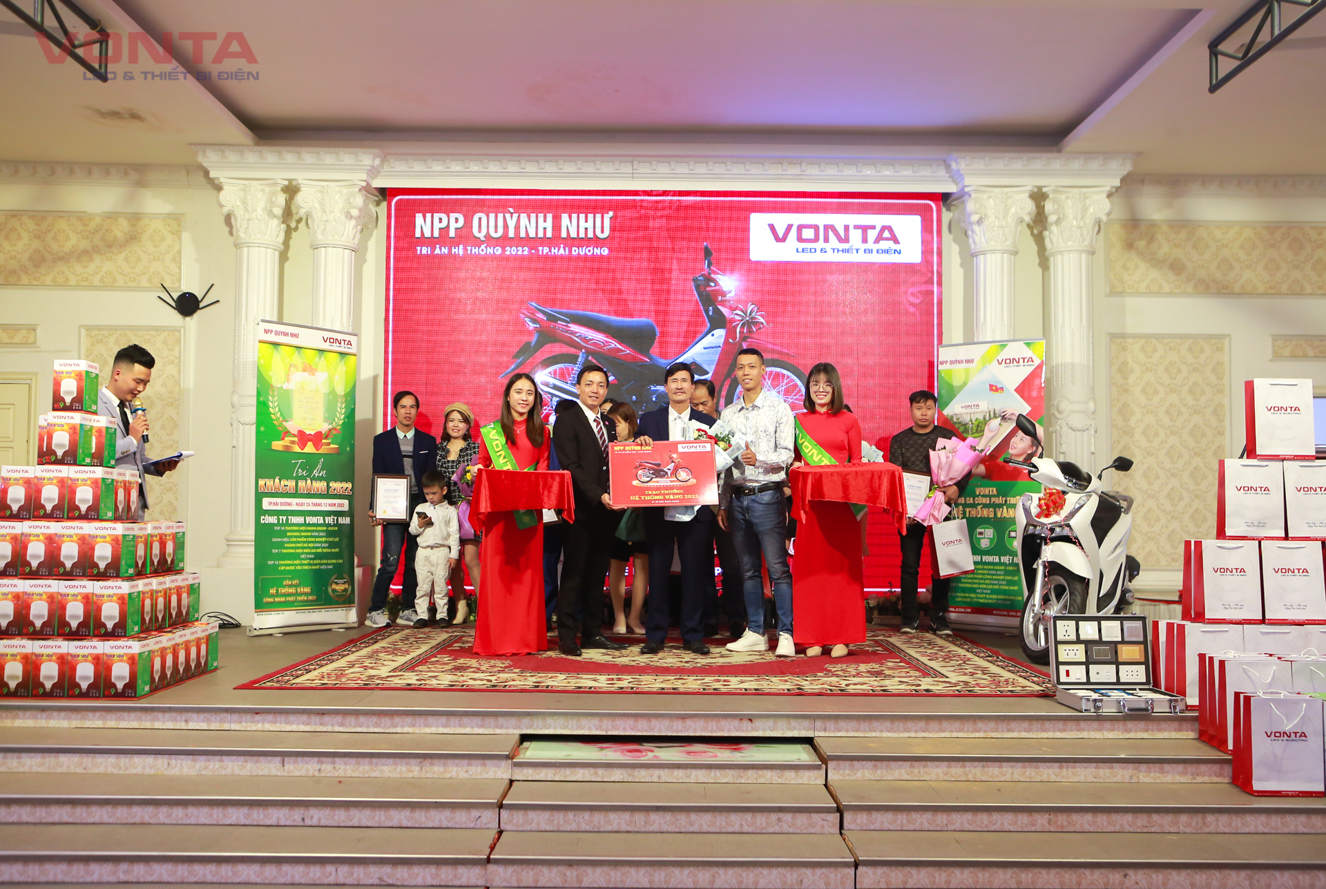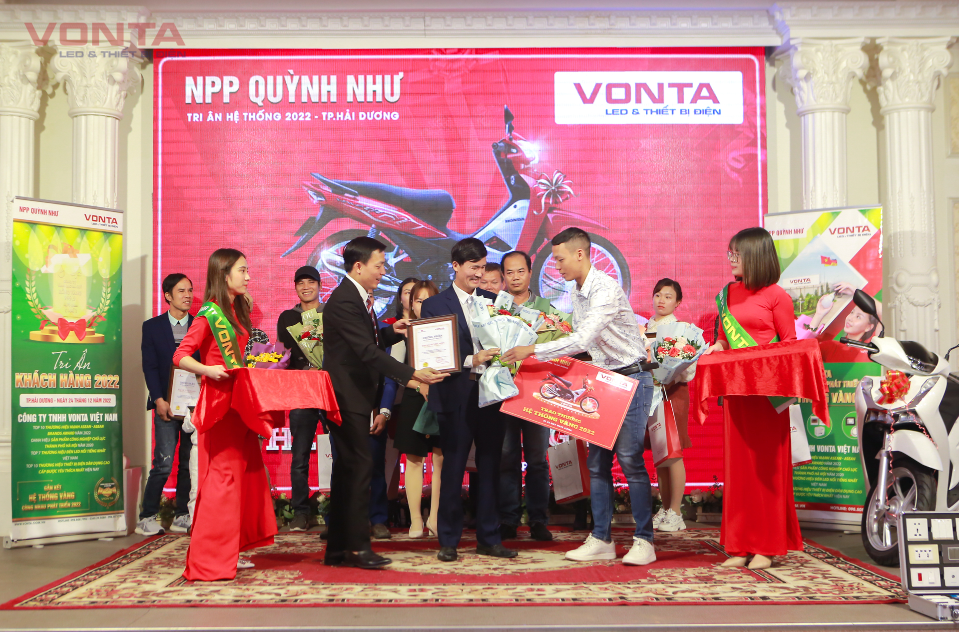 Tại buổi lễ, Công ty TNHH VONTA Việt Nam và NPP Quỳnh Như đã vinh danh trao – chứng nhận cũng như quà tặng Vàng cho các đại diện Top Hệ Thống Vàng, Đại Lý Vonta tại Hải Dương trong năm 2022. Trong đó đặc biệt đã có đại lý xuất sắc được vinh danh Top Hệ thống vàng 6 Sao và đón nhận giải thưởng cực lớn: 01 xe Honda SH & 1 cây vàng.